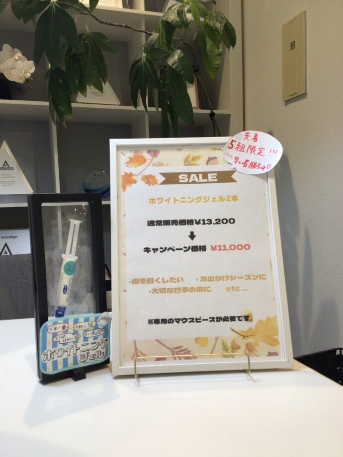 11月のセール品の紹介です🌼 2025年11月16日 (日) カテゴリー:未分類 こんにちは☺︎ ロータス歯科矯正歯科です🦷 今月のSALE品を紹介します🫧 ✨ホームホワイトニングジェル✨ 通常販売価格13200円→キャンペーン価格11000円 で販売します!! 大事な行事の前や、お出かけシーズンでお家で手軽に歯を白くしたい方におすすめです! 先着5名限定になります。この機会に是非ご購入下さい♪ ※ホームホワイトニングは専用のマウスピースが必要になります。 気になる方はロータススタッフまでお声かけください🧑🏻⚕️🌟 一覧へ戻る 次の記事へ